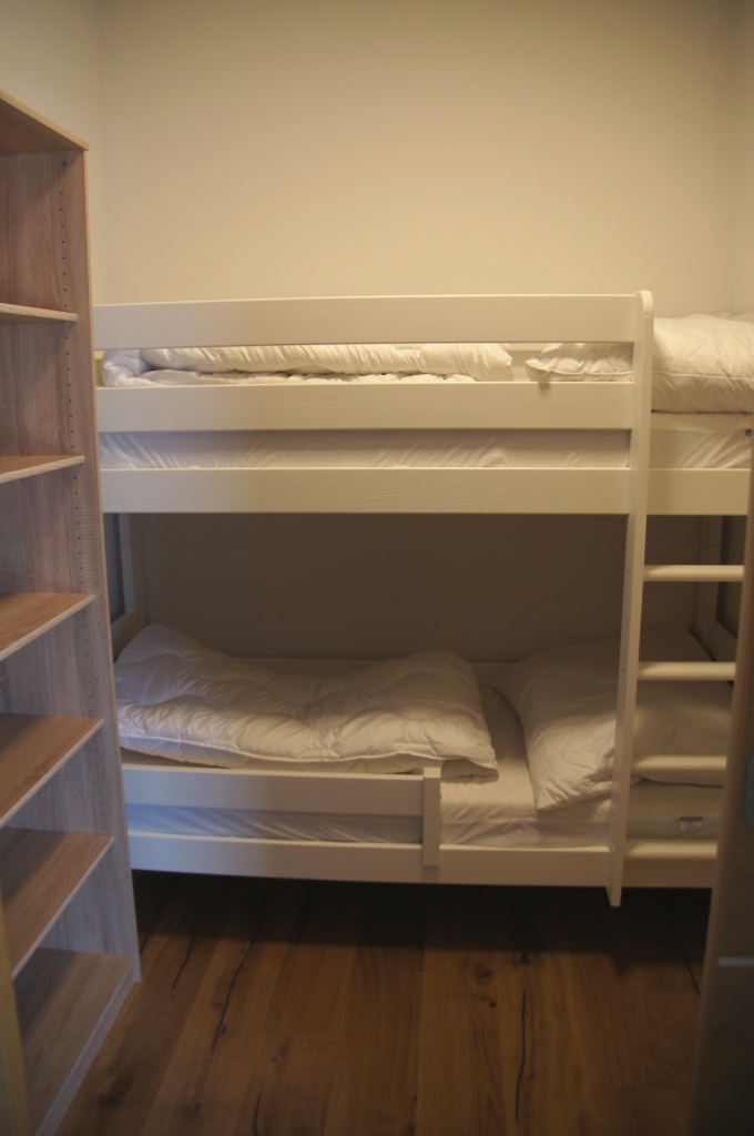 Kinderzimmer mit Stockbett (180cm x 80cm). Ein Fernseher befindet sich im Wohnbereich sowie im Elternschlafzimmer.